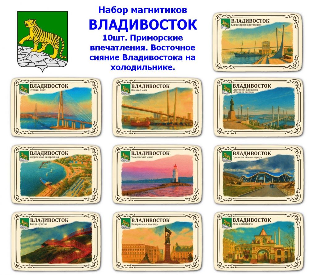 Описание Набор магнитиков ВЛАДИВОСТОК 10шт. Приморские впечатления. Восточное сияние Владивостока на холодильнике. Oz