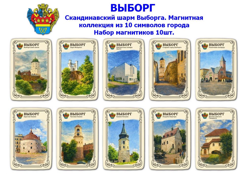 Описание Набор магнитиков ВЫБОРГ 10шт. Скандинавский шарм Выборга. Магнитная коллекция из 10 символов города Oz