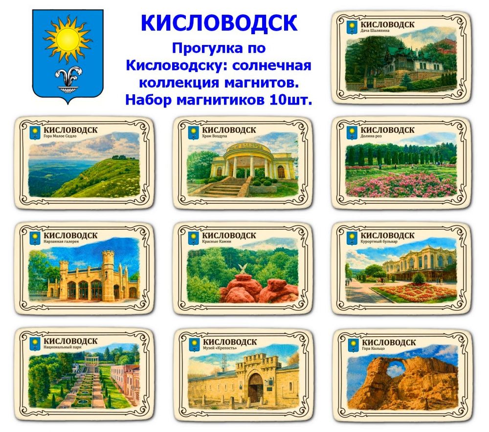 Перед вами коллекция из 10 ярких магнитов с изображением самых знаковых мест прекрасного города Кисловодск — популярного бальнеологического курорта Северного Кавказа.