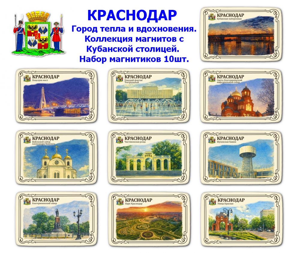 Представляем эксклюзивную серию магнитов, воплощающую неповторимый дух южного города Краснодарского края. Десять миниатюрных произведений искусства подарят ощущение тепла, щедрости и энергии кубанского края, превратив обычную бытовую технику в настоящую галерею местных достопримечательностей.