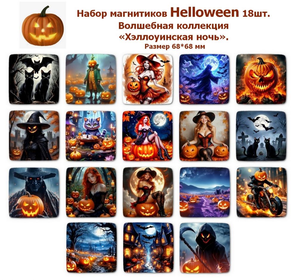 Описание Набор магнитиков Helloween 18шт. Волшебная коллекция «Хэллоуинская ночь». Размер 68*68 мм Oz