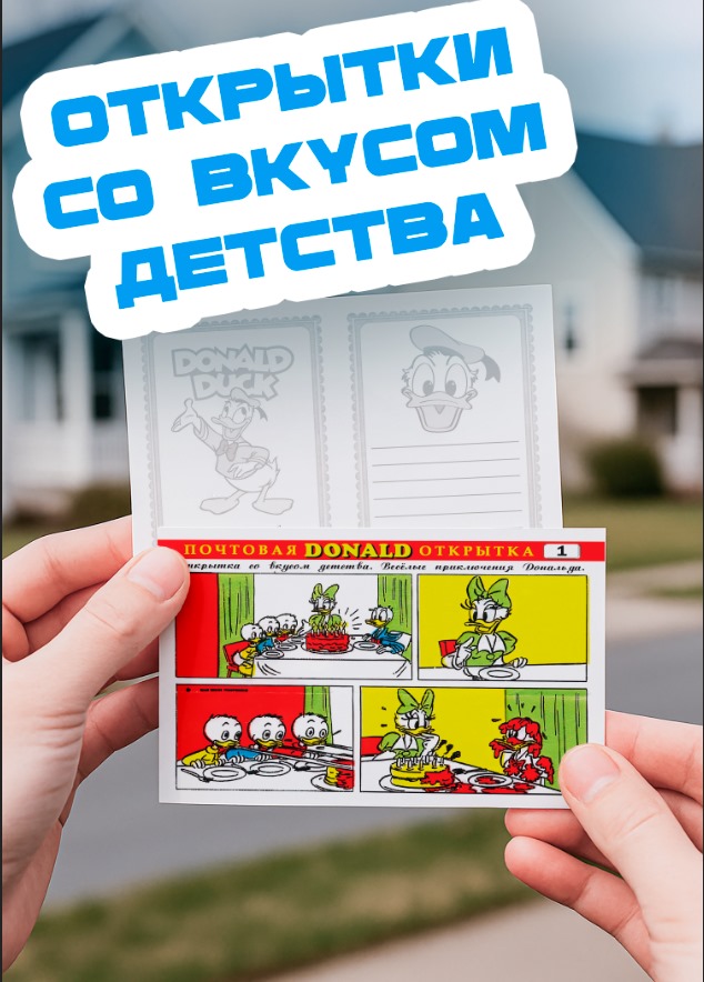 Эти оригинальные почтовые открытки выполнены в стиле ретро, на которых запечатлены изображения классических вкладышей от легендарной жевательной резинки серии Donald. Изображения выполнено яркими красками, передающими атмосферу детства и беззаботности. Центральное место занимает главный герой — озорной и харизматичный Дональд Дак, чьи выразительные эмоции делают каждую открытку уникальной и запоминающейся.