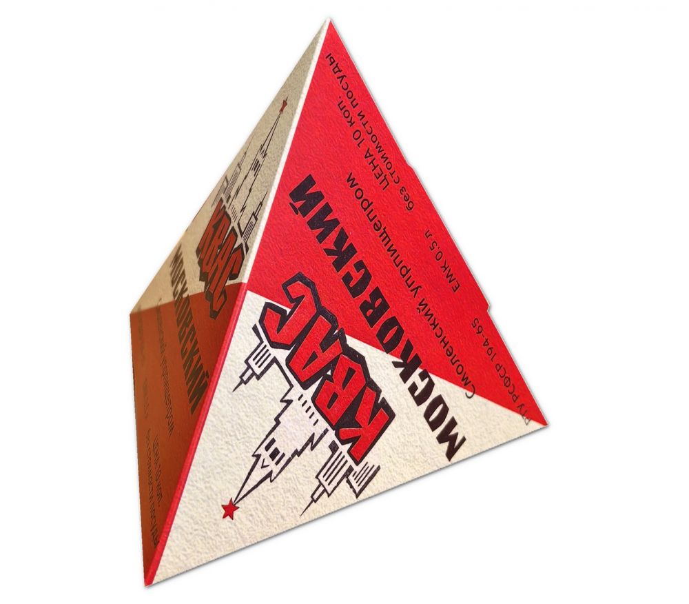 Мы решили воссоздать тот самый символ из прошлого, но уже без технологии ТетраПак. Наш треугольник стилизован под ретро дизайн и его можно использовать не только для декора в стиле СССР, но также ему можно найти и практическое применение. К примеру его можно использовать как подарочную упаковку. В него можно сложить конфеты или поместить другой небольшой памятный, винтажный презент. Ну, а чтобы получился уже некий антураж из советского прошлого, то пирамидки лучше всего поместить в авоську.