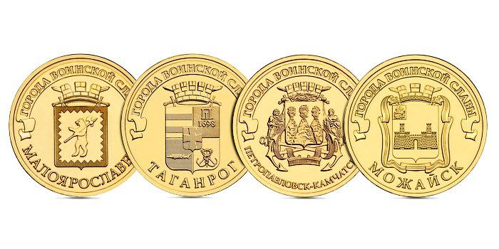 Описание 10 рублей ГВС 2015г. Малоярославец + Можайск + Таганрог + Петропавловск-Камчатский UNC