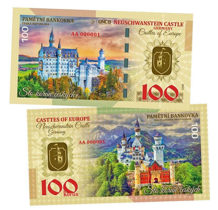 100 крон - Neuschwanstein Castle. Замки Европы. UNСB. Памятная банкнота. UNC (БМ)