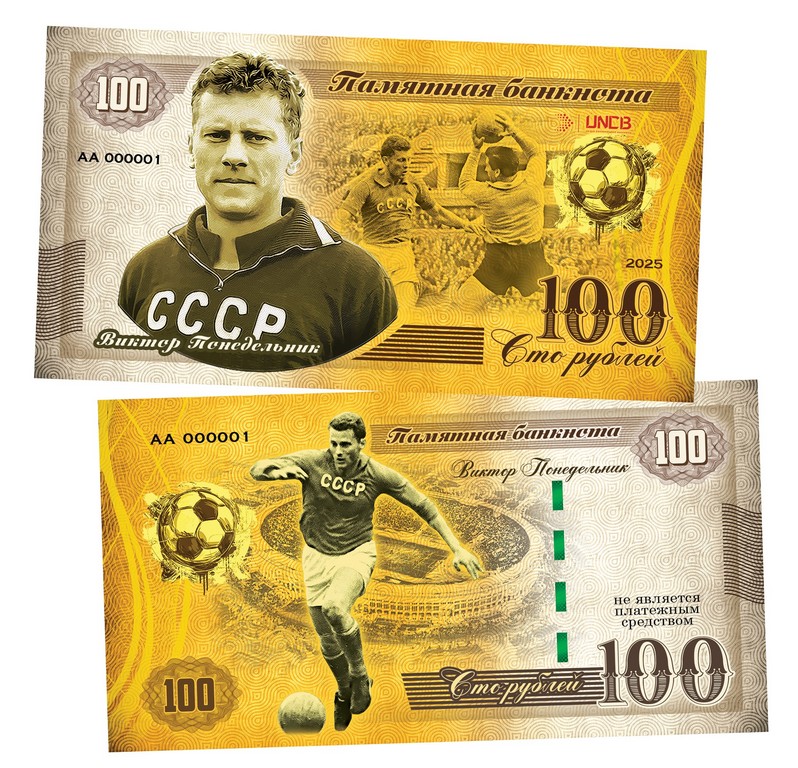 100 рублей — Виктор Понедельник. Легендарные футболисты СССР. Памятная банкнота. UNC