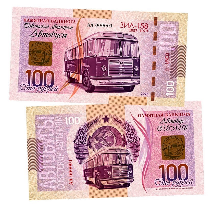 Описание 100 рублей — ЗИЛ 158. Советский Автопром — Автобусы. Памятная банкнота. UNC Oz Msh