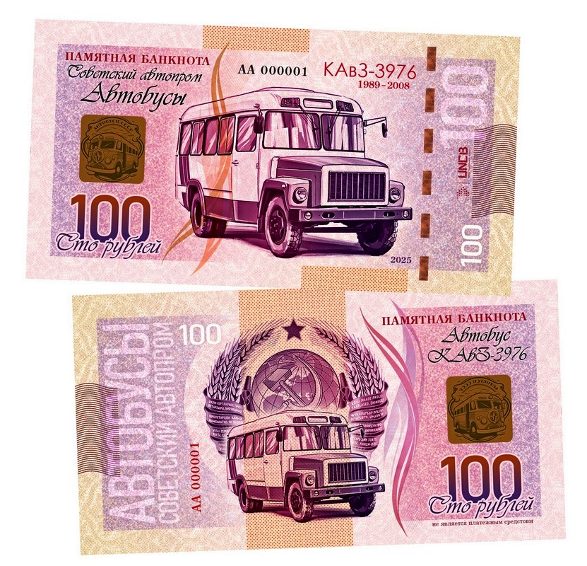 Описание 100 рублей — КавЗ-3976. Советский Автопром — Автобусы. Памятная банкнота. UNC Oz Msh