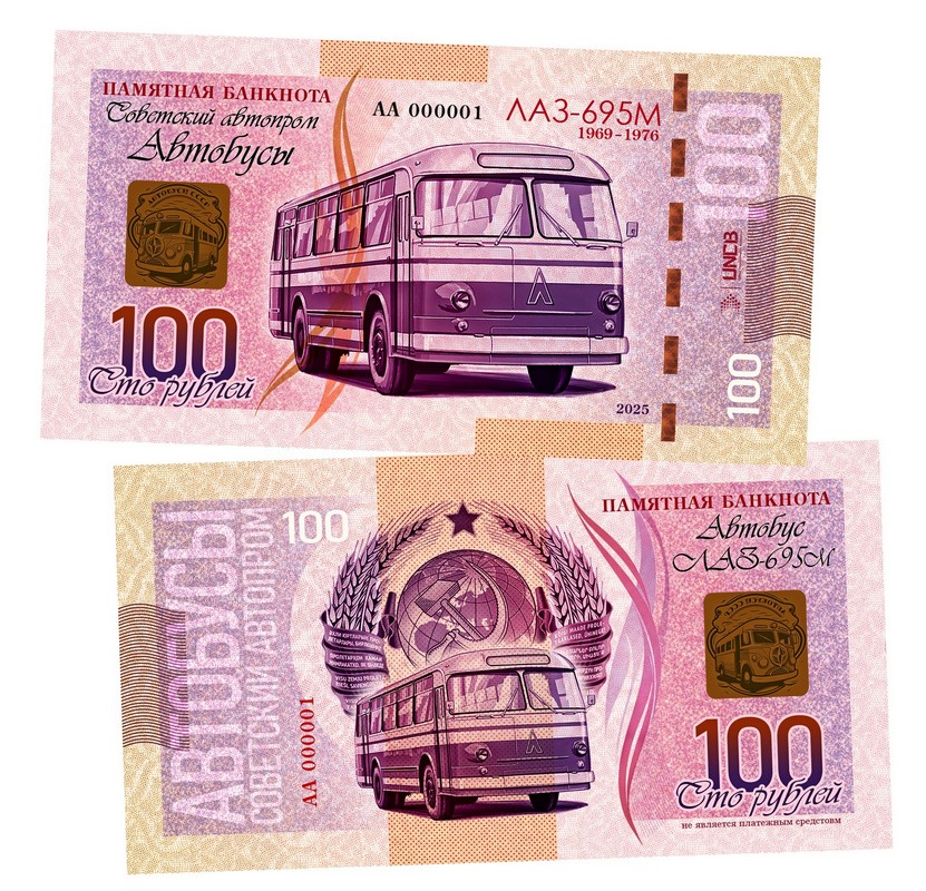 Описание 100 рублей — ЛАЗ-695М. Советский Автопром — Автобусы. Памятная банкнота. UNC Oz Msh