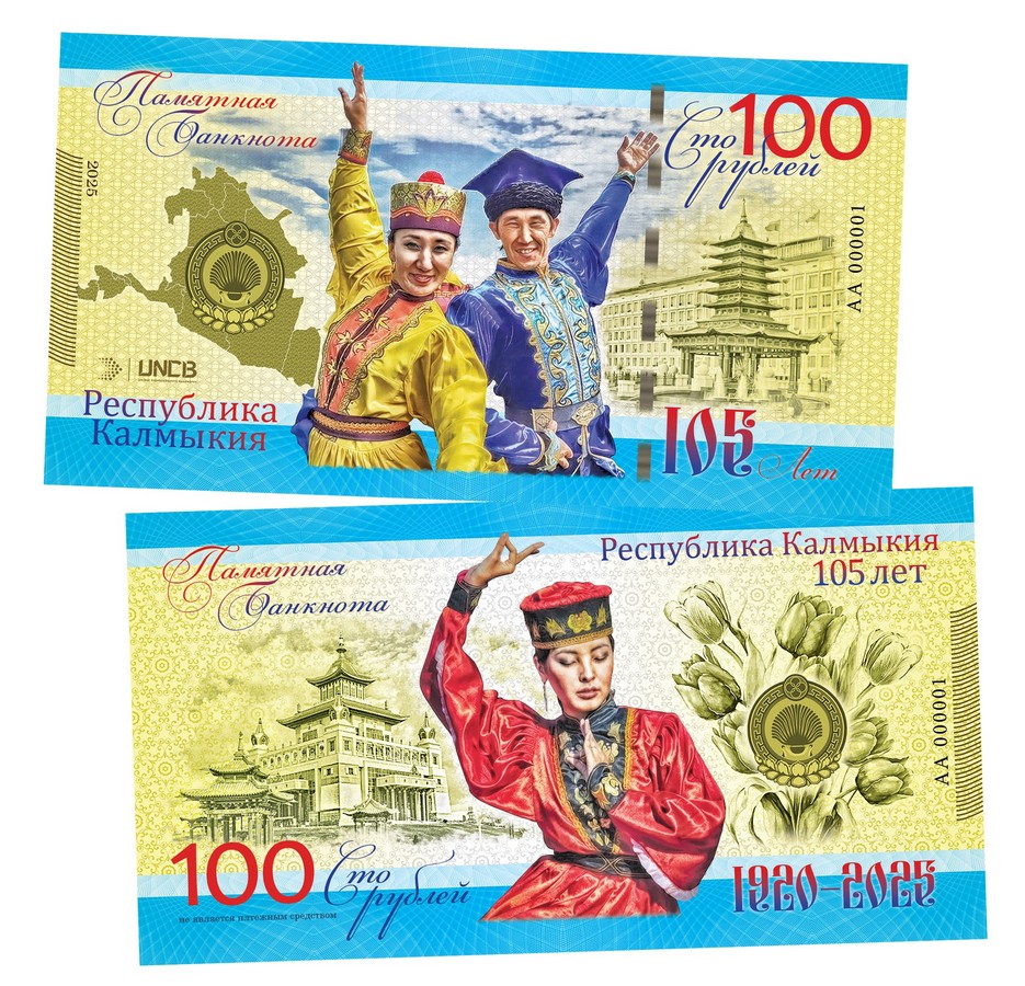 Описание 100 рублей — Республика Калмыкия 105 лет. Памятная банкнота. UNC Oz Msh