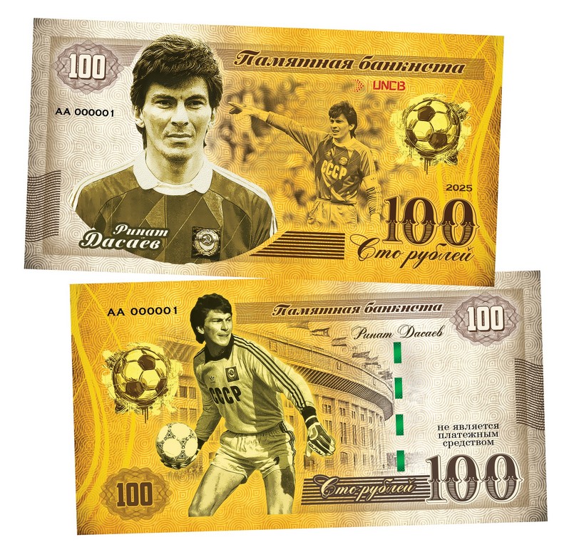 100 рублей — Ринат Дасаев. Легендарные футболисты СССР. Памятная банкнота. UNC