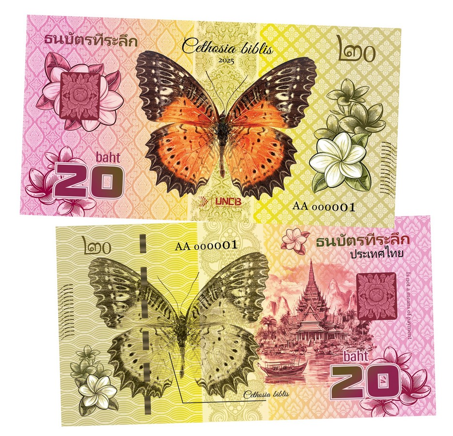 Описание 20 бат Тайланд — Cethosia biblis. Серия Бабочки мира. Памятная банкнота. UNC (БМ) Oz