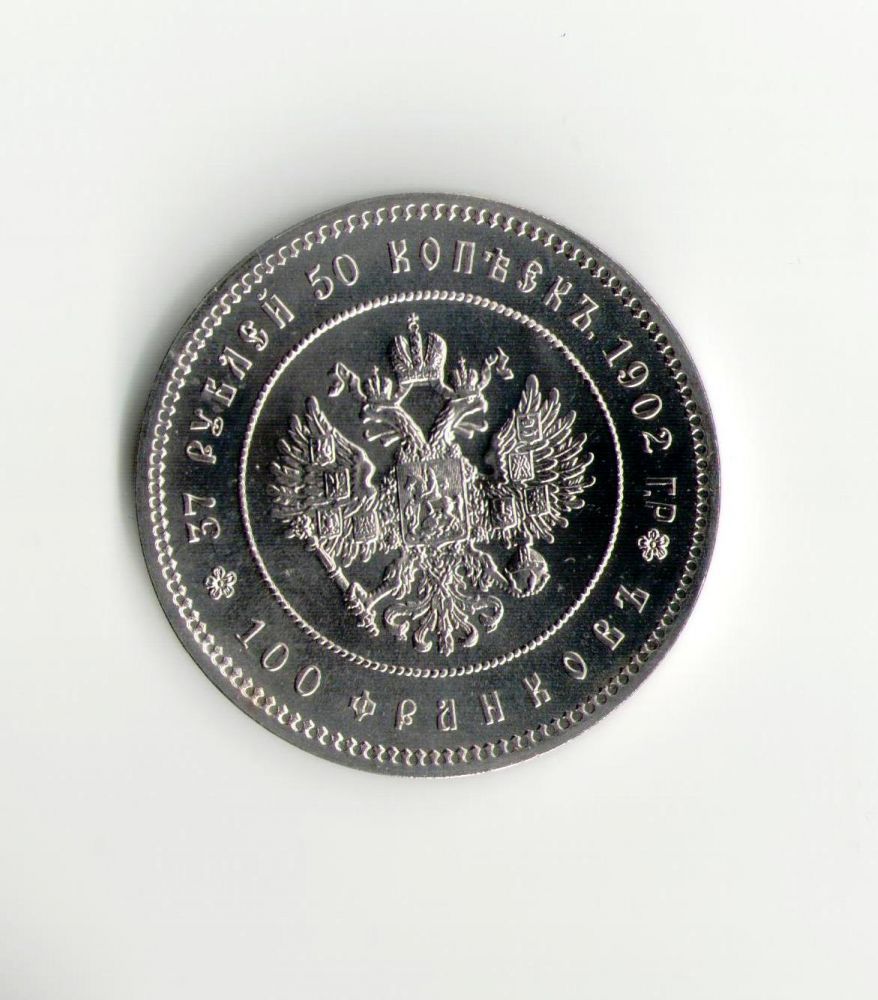 В 1902 году Российское правительство выпустило монету номиналом 37 руб 50 коп - 100 франков. Есть официальное предположение, что таким образом Николай Второй хотел ознаменовать франко-русский союз, однако нумизматы более склоняются к мысли, что 100 франков были предназначены для обращения в системе казино. По курсу 100 франков составляли крайне нелогичный российский номинал — 37 рублей 50 копеек и имели еще более нелогичный вес, идентичный двум с половиной империалам. В то время, когда все привязывалось к стоимости золота, 100 франков не могли восприниматься иначе, чем нонсенс российской монетной системы. Все говорит о том, что эти монеты были не для обращения. В том числе небольшой тираж.