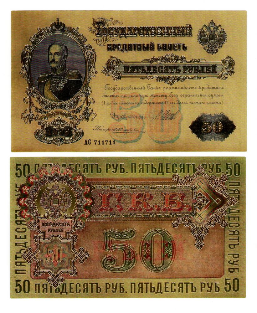 Описание 50 рублей Российская империя 1899 год Николай 1 Позолоченная купюра Цветная Банкнота под золото Бона
