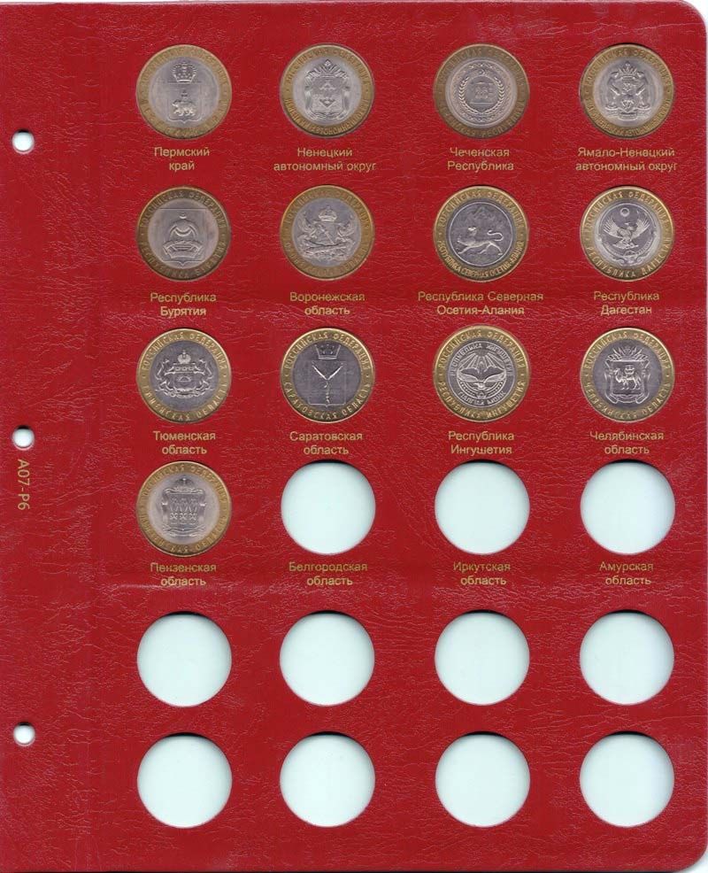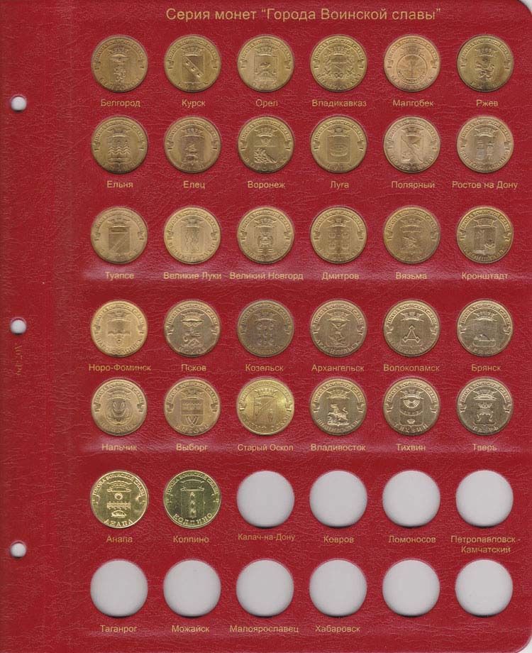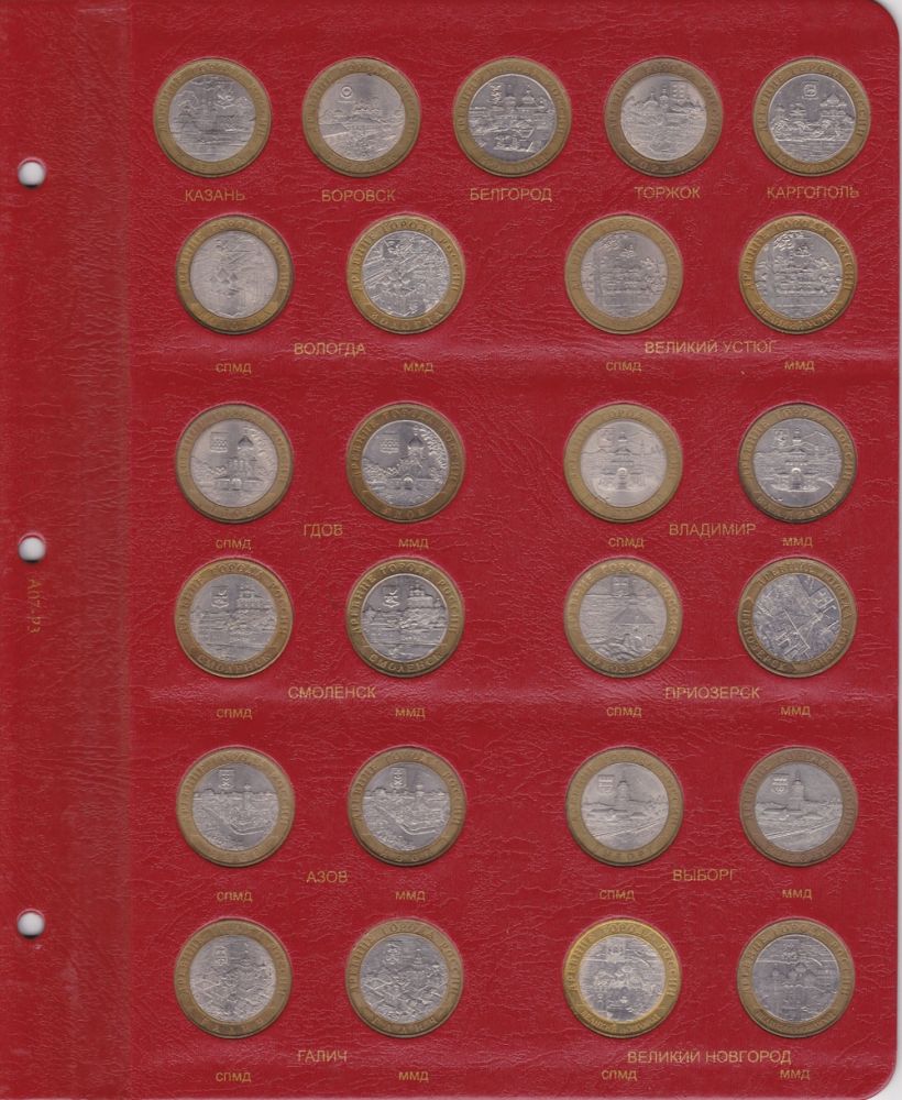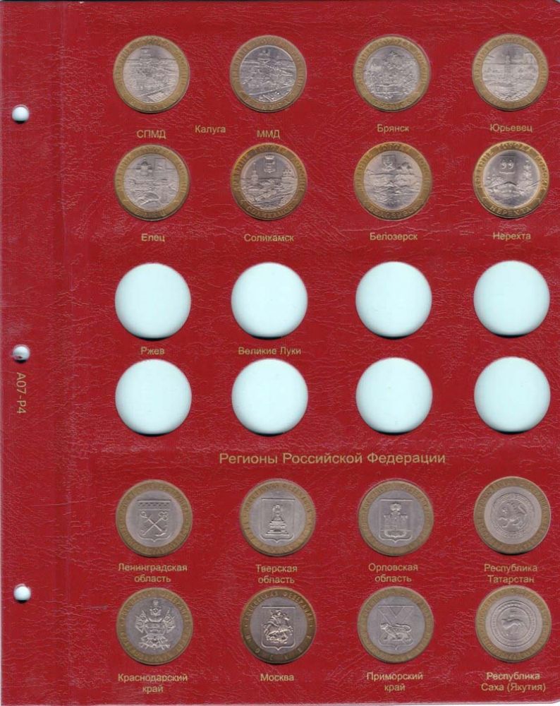 - все серии биметаллических десяток "Древние города", "Регионы России", "Памятные события", "Министерства РФ" - все с учётом монетных дворов, выпустивших эти монеты (всего 128 ячеек под монеты 10 рублей - биметалл);