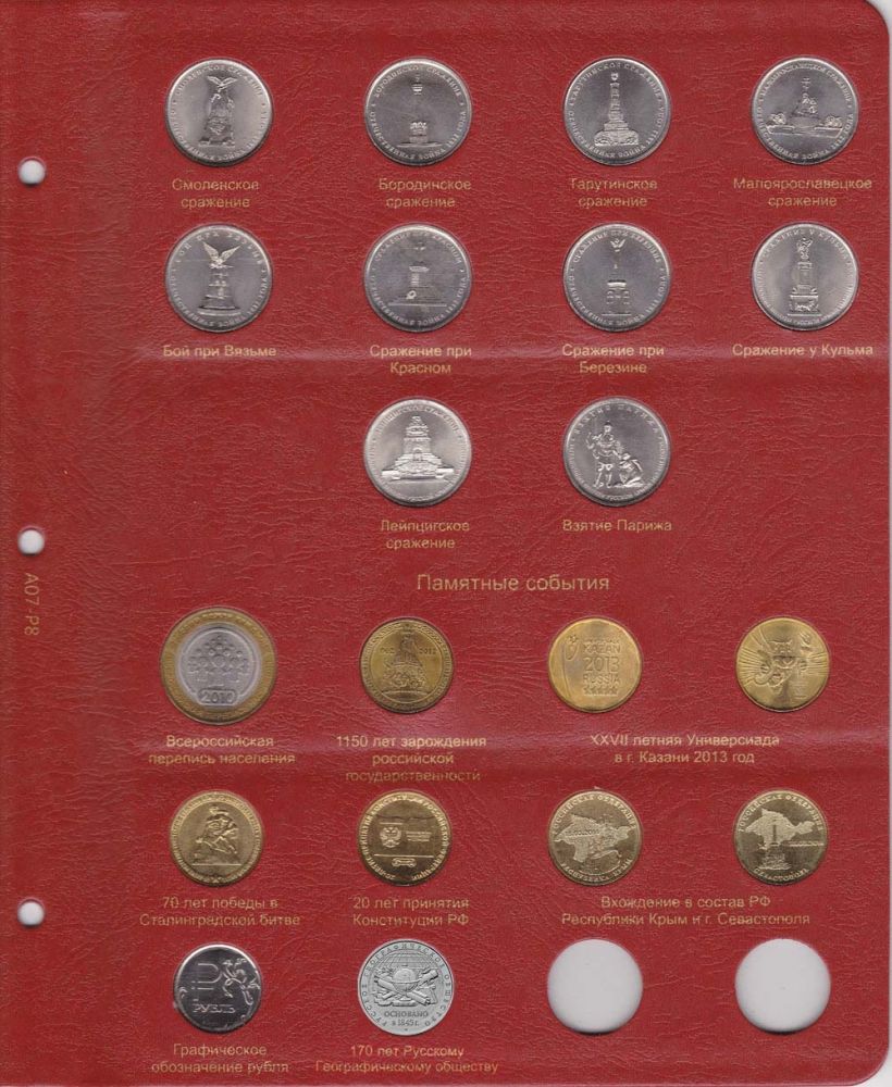 Все юбилейные монеты России в одном альбоме для монет! Биметаллические 10 рублей и ГВС, выпуск Бородино 1812 года, десятки Универсиада в Казани, Графическое обозначение рубля, 170 лет Русскому Географическому обществу, серия 2 рубля Города-герои - в одном издании! Мечта нумизмата и коллекционера современных российских монет!