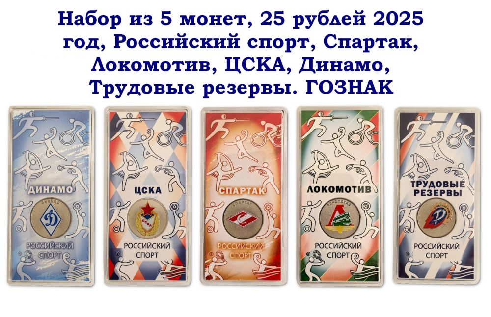 Описание Набор из 5 монет, 25 рублей 2025 год, Российский спорт, Спартак, Локомотив, ЦСКА, Динамо, Трудовые резервы. ГОЗНАК