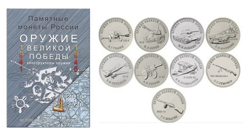 Описание Набор из 9 монет 25 рублей 2019. Оружие Великой Победы (конструкторы оружия) + АЛЬБОМ