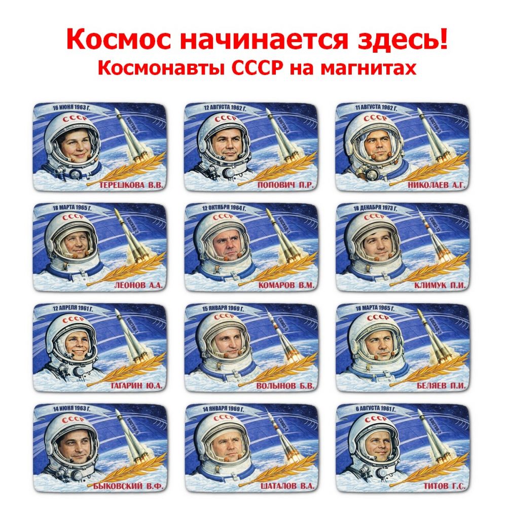 Описание Набор магнитиков Космос начинается здесь! Космонавты СССР на магнитах. Oz